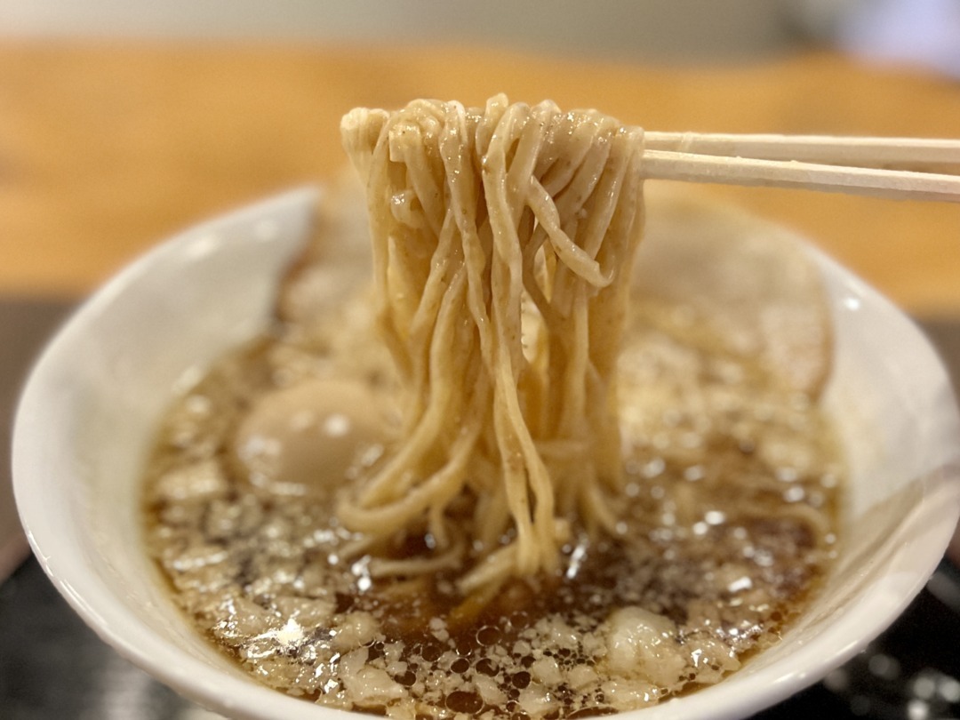 今回いただいた「特製醤油ラーメン 煮卵入り」(1,210円)は、鶏ガラと煮干しに豚の背脂を合わせた一杯。