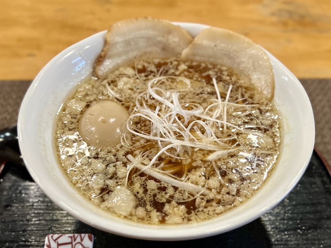今回いただいた「特製醤油ラーメン 煮卵入り」(1,210円)は、鶏ガラと煮干しに豚の背脂を合わせた一杯。