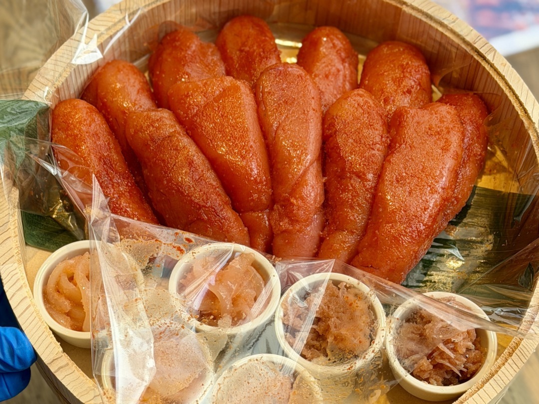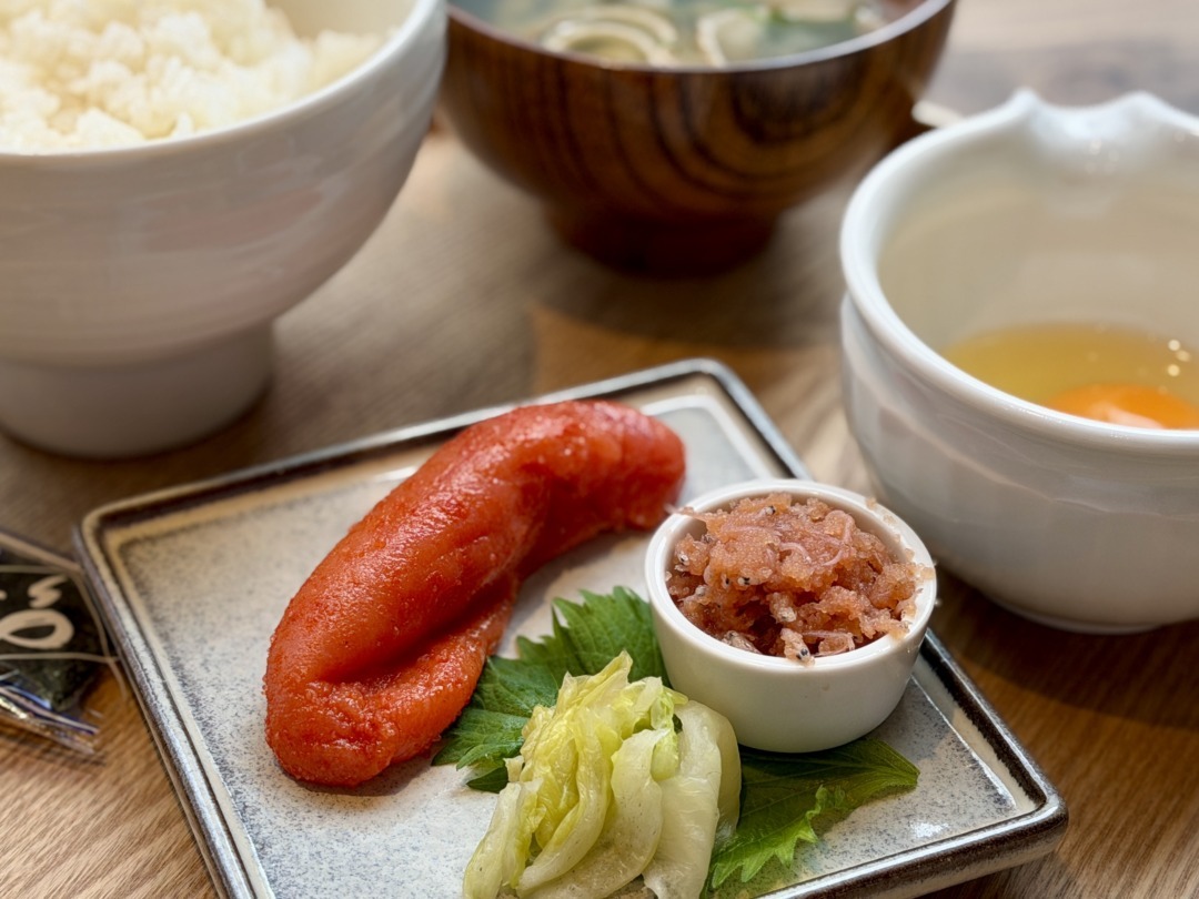 注文時に、明太子と和え物めんたい(この日は「イカめんたい」と「じゃこめんたい」の2種類)を実物で見せてくれ、その中から好みで選べるスタイル。明太子は2本目から+500円/本で追加可能だ。今回は季節替わりの「じゃこめんたい」をチョイス。和え物の内容は時期によって変わるようだ。