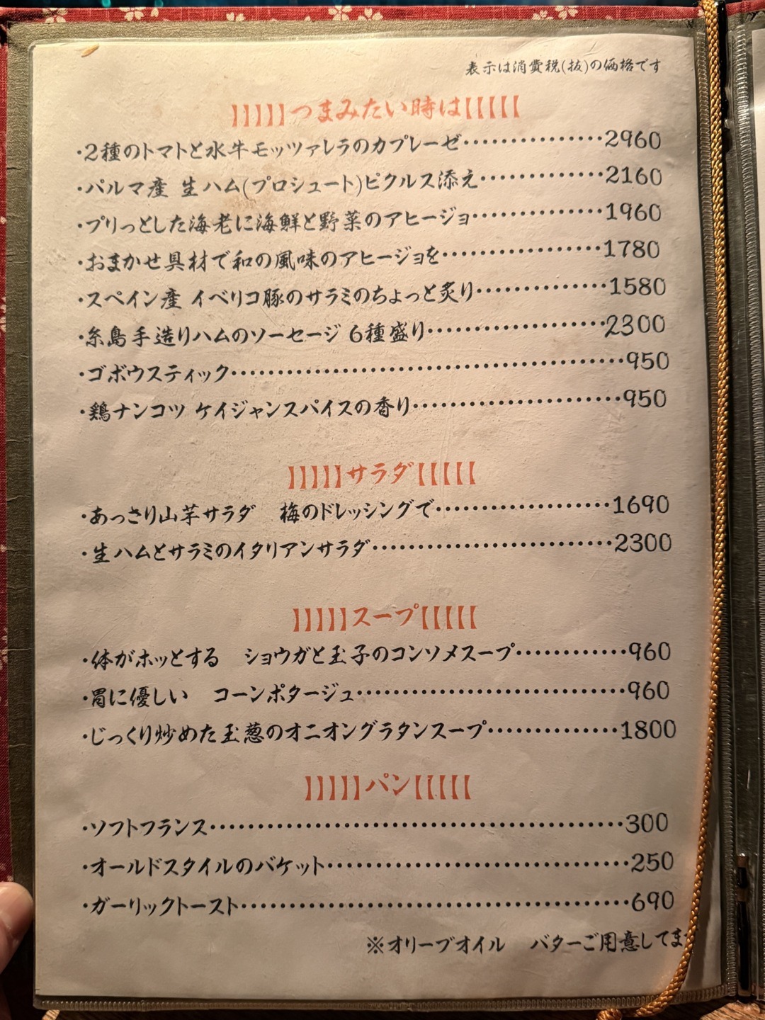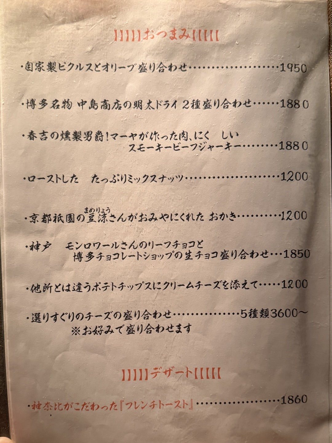 フードメニューも充実しており、つまみからサラダ、スープ、パン、ピザ、パスタ、卵料理、肉料理まで幅広く揃う。