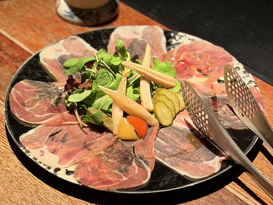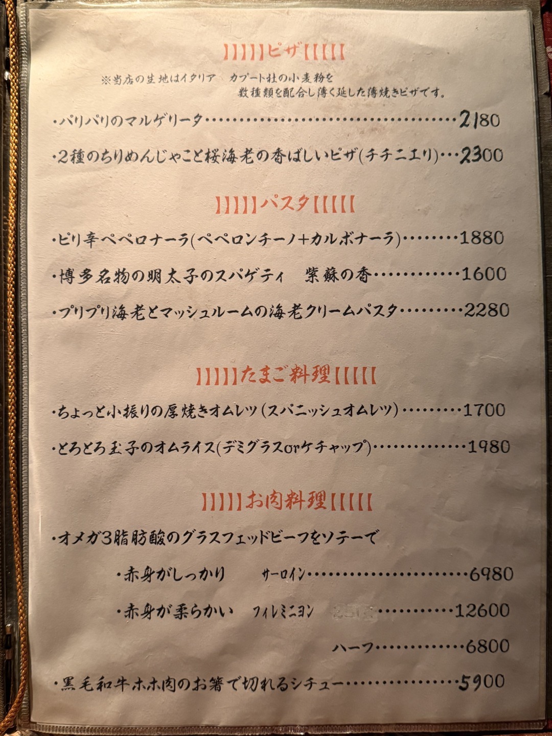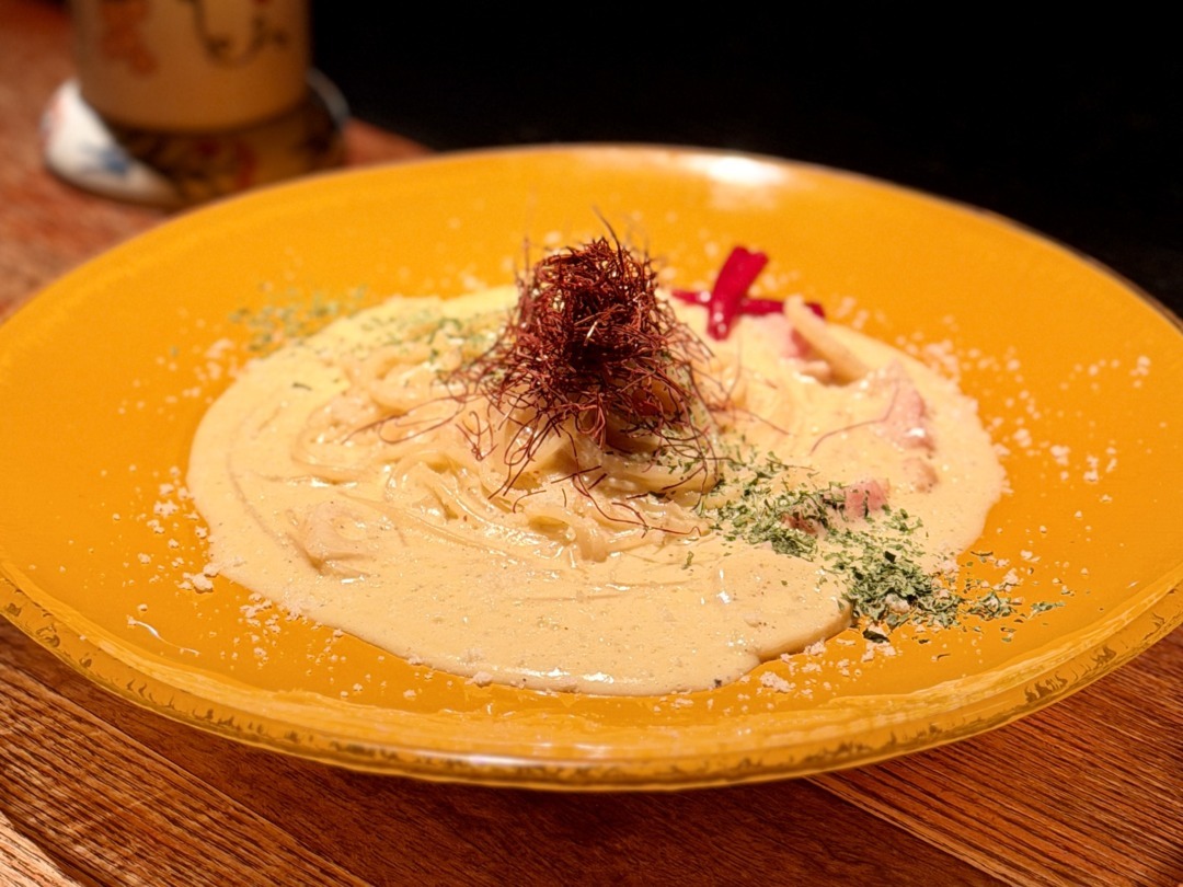 おすすめは「ピリ辛ペペロナーラ」(2,068円)。ペペロンチーノとカルボナーラを掛け合わせた一皿で、ひと言でいえば“辛いカルボナーラ”。宮内庁御用達の実績を持つ北九州・ヤギシタハムのベーコンを使うなど、素材にも抜かりがない。