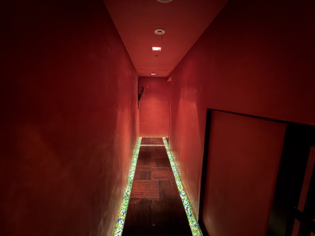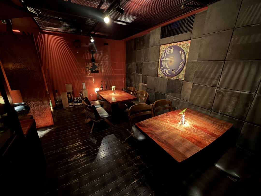 店内は朱を基調に、木・石・水といった自然素材を織り交ぜた設えで、日本の美意識が静かに息づいている。光を抑え、影を活かした空間には、どこか艶のある落ち着きがある。
