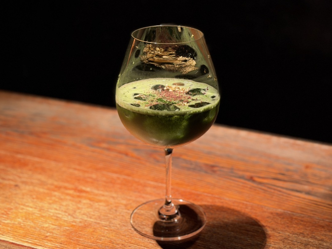 「博多抹茶比」(2,530円)は、京都の一保堂茶舗の抹茶を使ったウォッカベースの一杯。抹茶のほろ苦さが余韻として残る、まさに大人のカクテルで、この空間によく似合う。