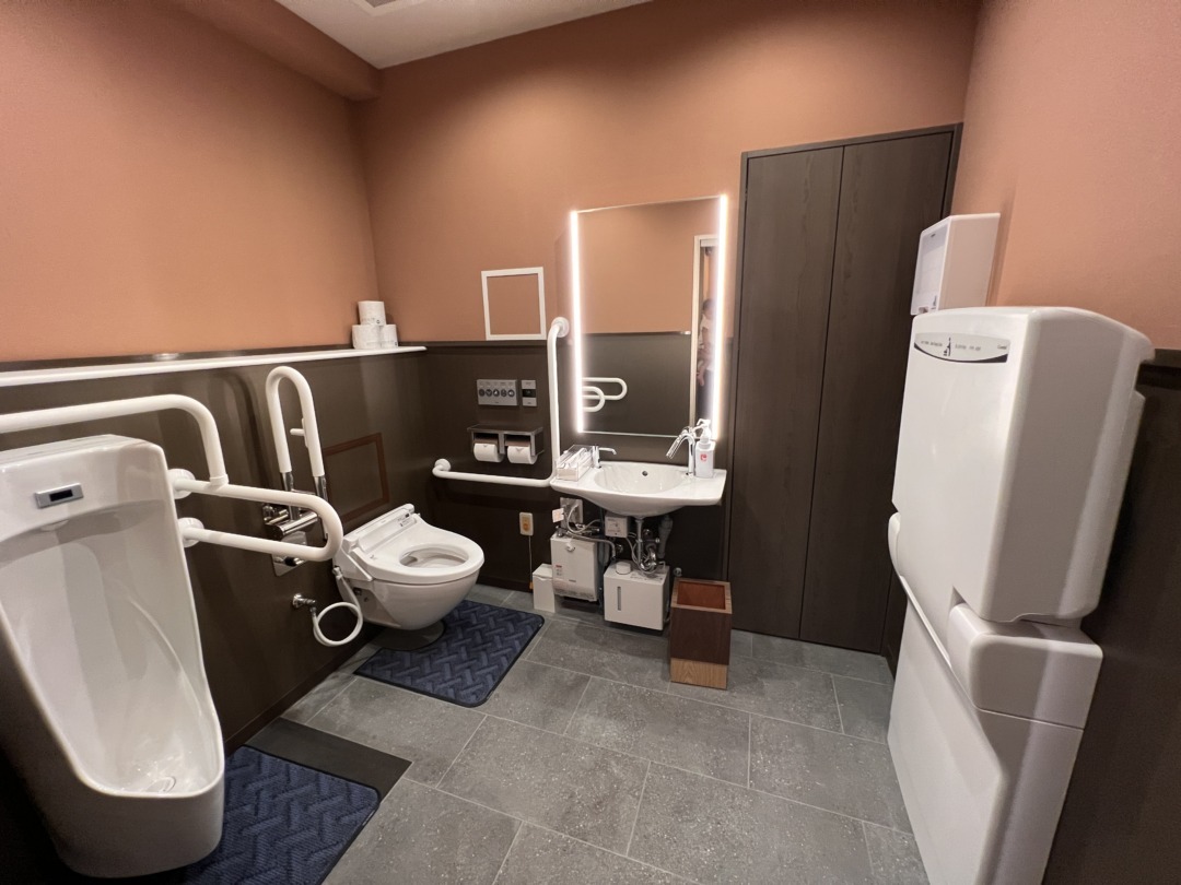 1階にはおむつ交換台付きのトイレもあり、子連れでも安心。