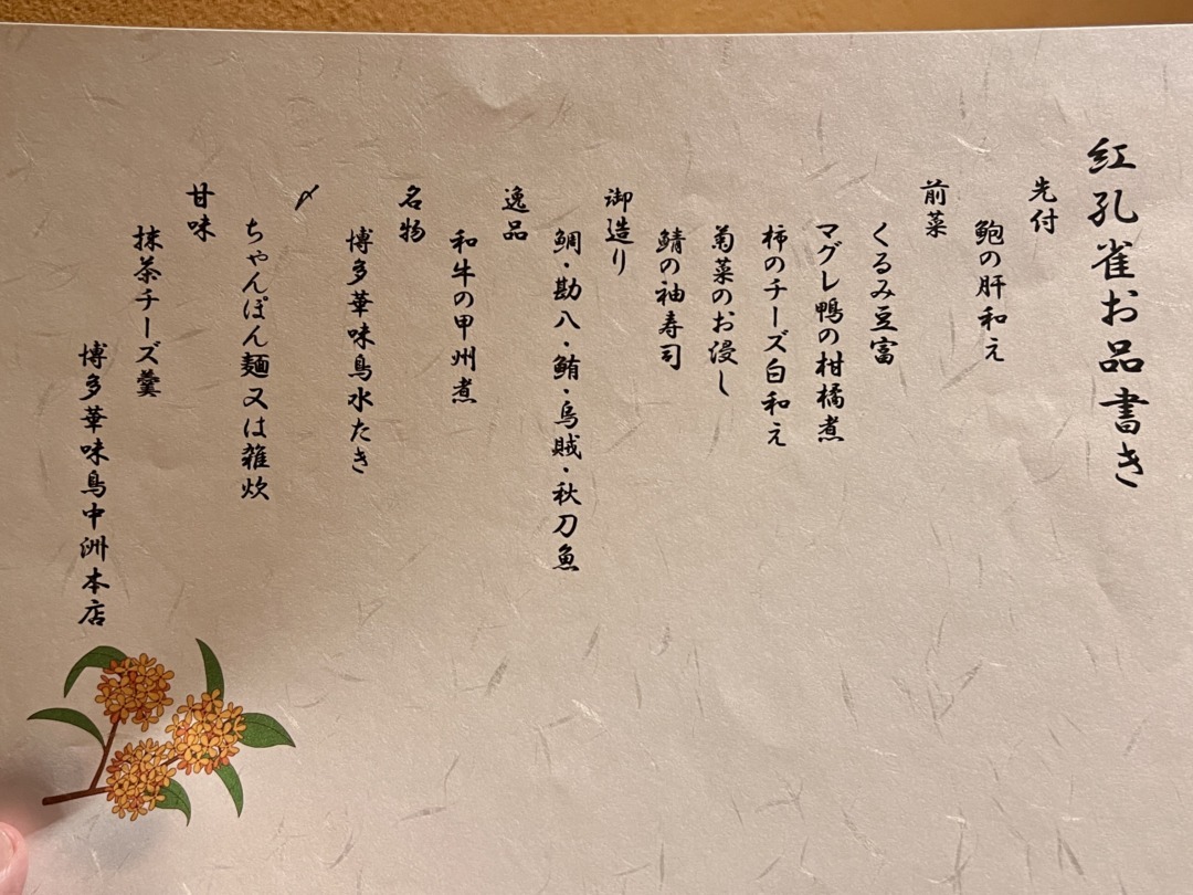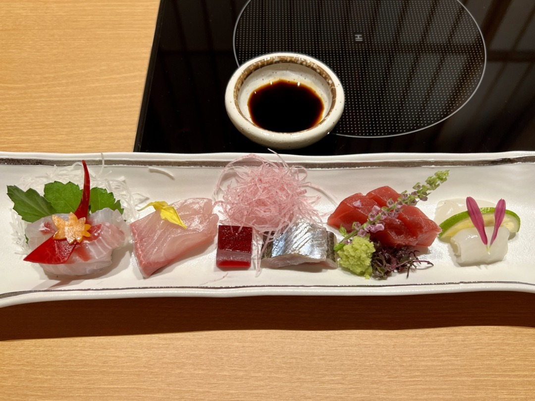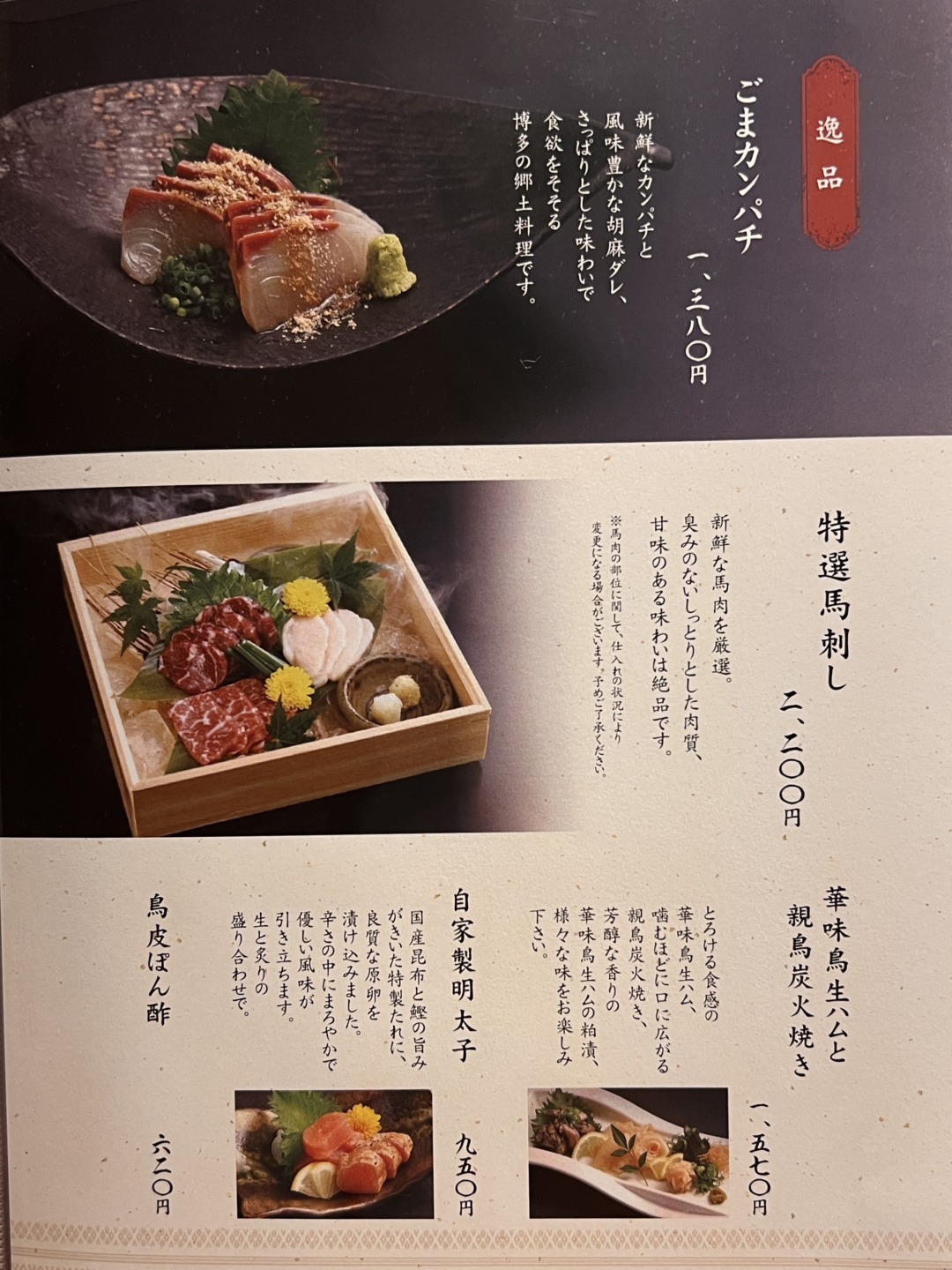 先付、前菜5品、御造り、逸品、名物の水たき、〆(ちゃんぽん麺または雑炊)、甘味と続く贅沢な構成だ。