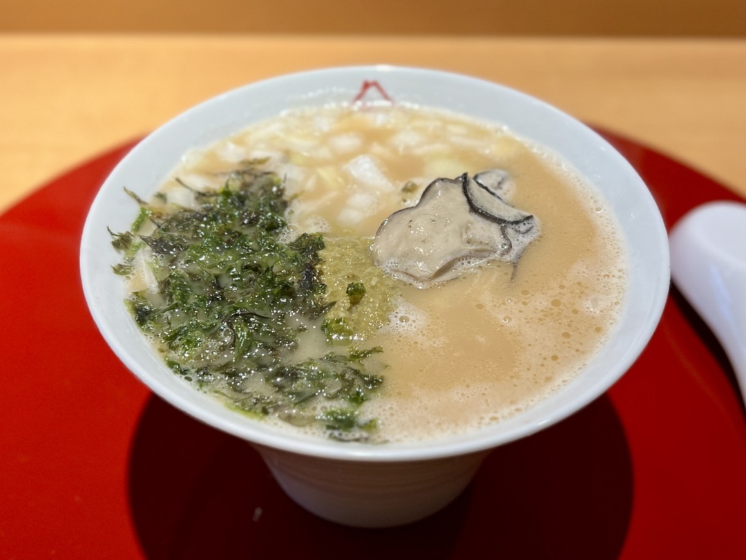 トッピングはプリプリの牡蠣が3つ、牡蠣ペースト、海苔、玉ねぎ