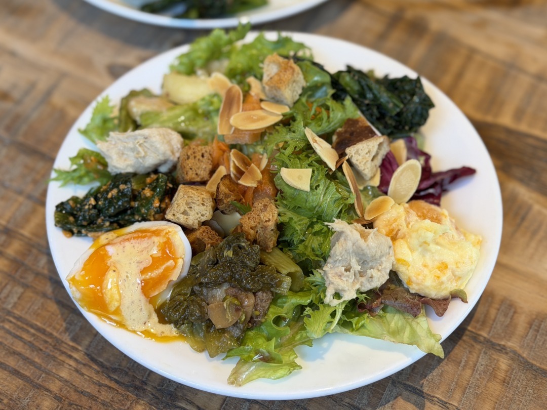 ランチに付くサラダには、アーモンドやタラッリーニのようなカリッとした具材も入り、食感のアクセントが楽しい。