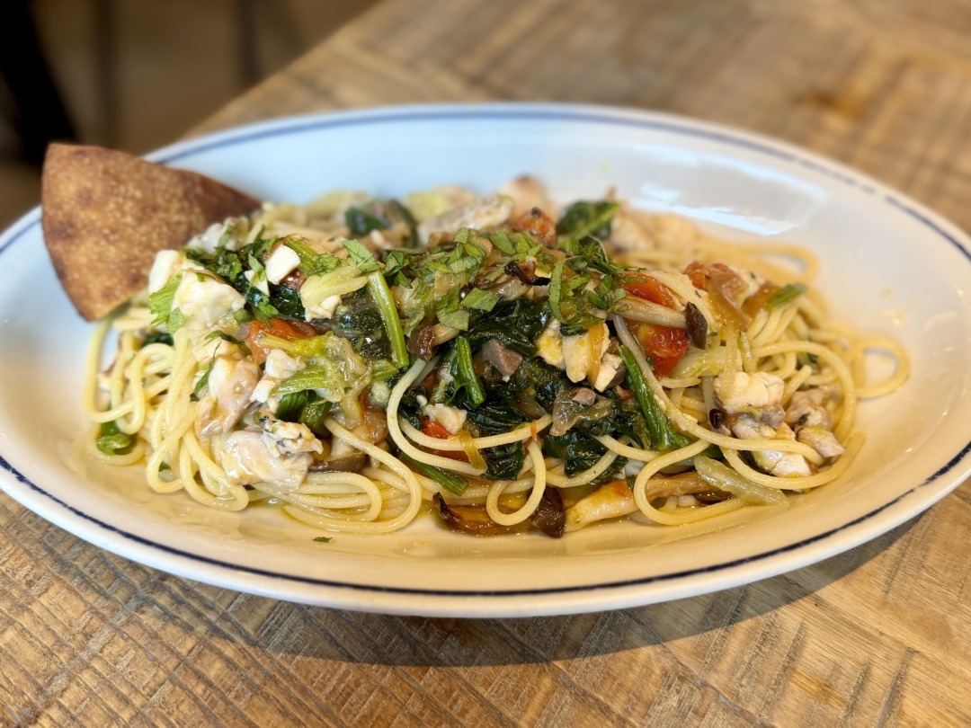 「アジとホウレンソウ、キャベツ、プチトマトのオイルパスタ」は、モチッとしたパスタに具材もたっぷりで、満足感の高い一皿だ。