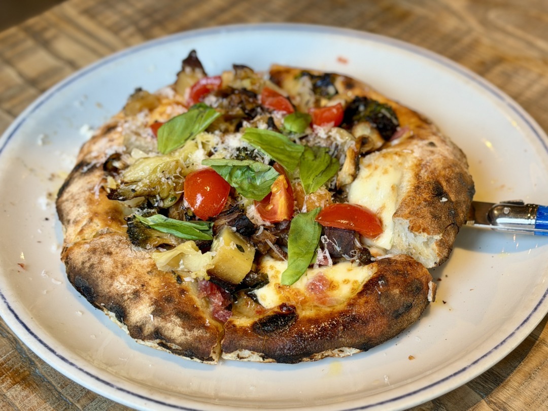 「サラミといろいろ窯焼き野菜ピッツァ」は、野菜を高温・短時間で焼き上げることで、表面の香ばしさと中の瑞々しさを両立。