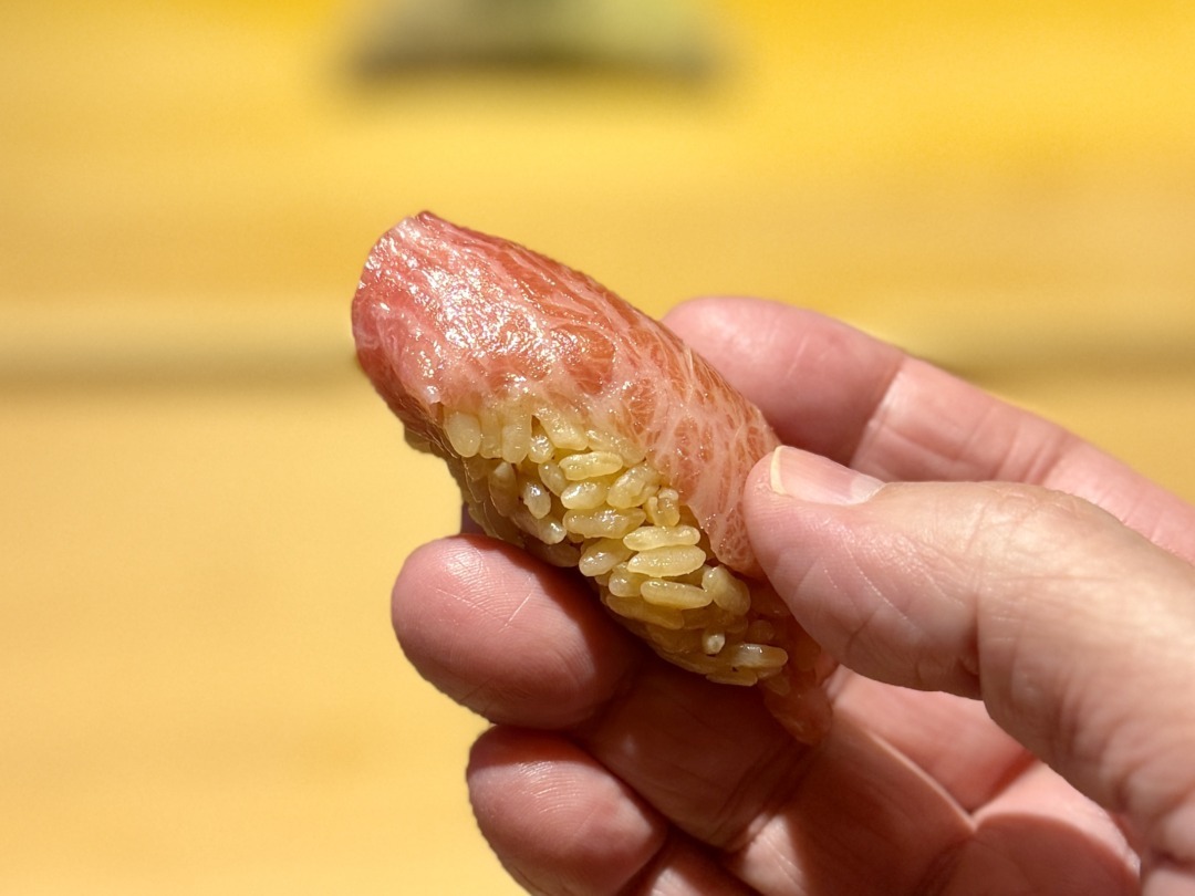 赤酢のシャリはやや硬めで、口の中でほどける感覚が印象的。