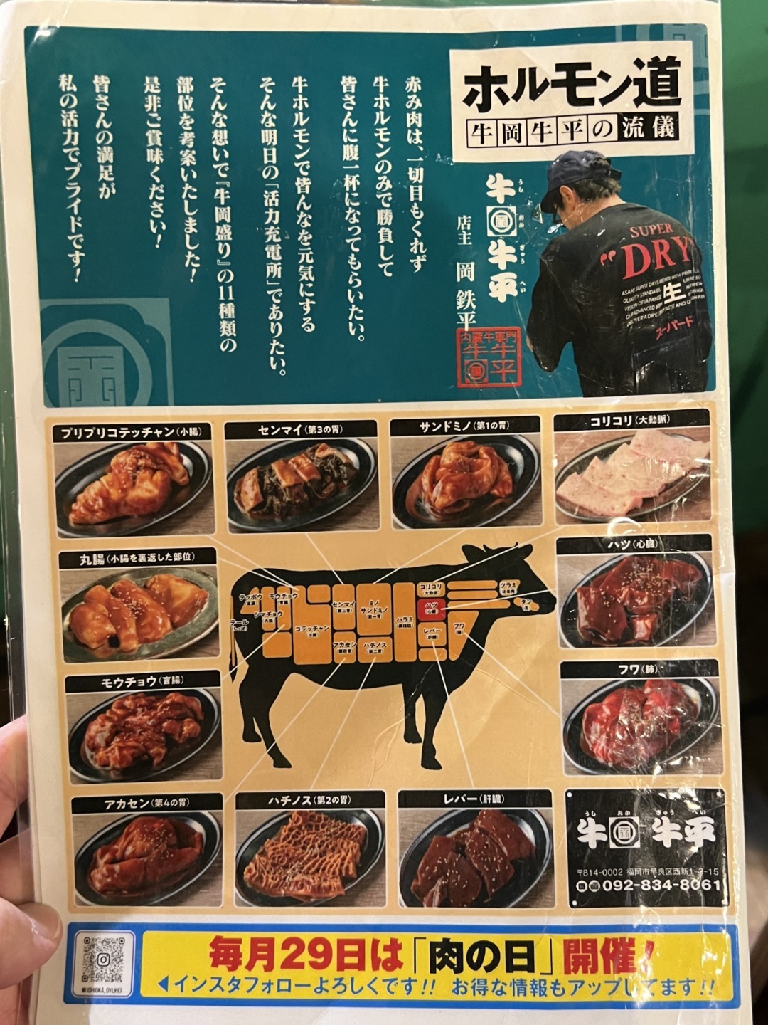 西新にある「牛岡牛平」は、牛の内臓専門店。ホルモン好きにはたまらない一軒だ。