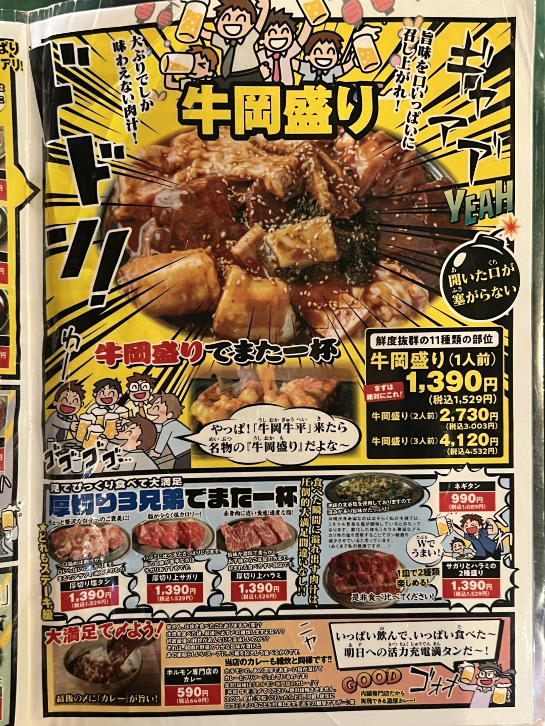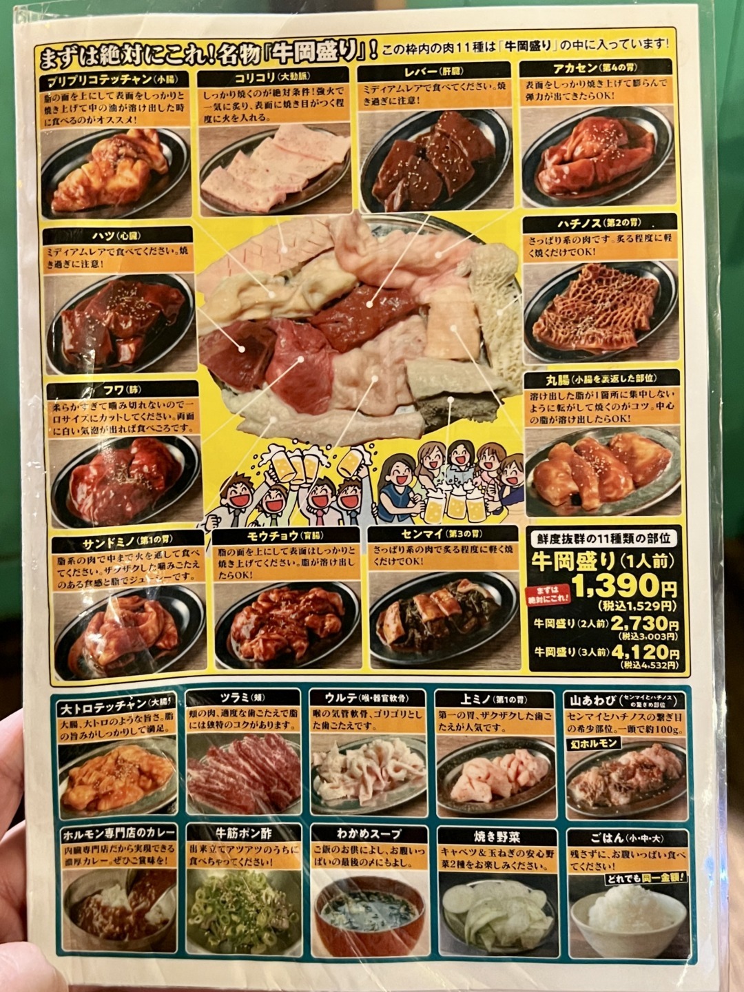 必食は、11種類のホルモンが盛り込まれた「牛岡盛り」(1人前1,529円)。